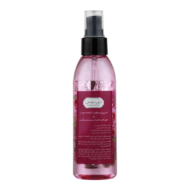 خواص گلاب برای پوست بسیار زیاد است تا آنجایی که امروزه در تولید محصولات مراقبتی پوست از آن استفاده میکنند. در کنار خاصیتهای بی نظیر گلاب، رایحه و عطر آن خستگی را از تن هر کسی بیرون کرده و باعث افراد میشود. در تولید اسپری مرطوب کننده صورت رز دیپ سنس از گلاب ارگانیک، عصاره بابونه و آویشن استفاده شده است که با خواص آنتی اکسیدانی موجب روشنی پوست میشود، همچنین پف پوست را کاهش میدهد.