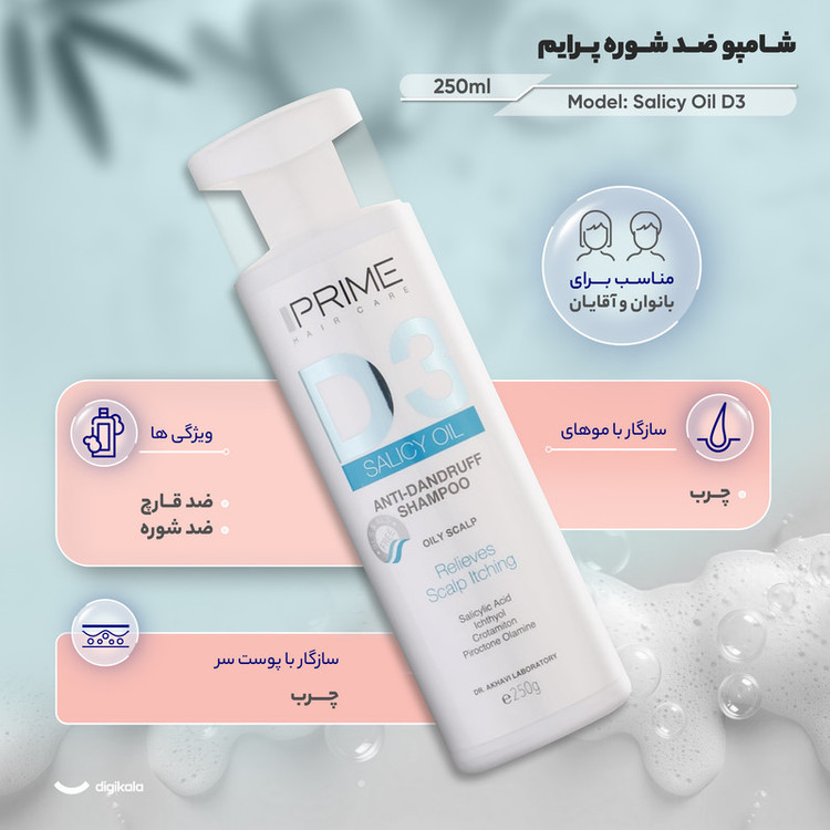 شامپو ضد شوره پرایم مدل Salicy Oil D3 مناسب موهای چرب حجم 250 میلیلیتر